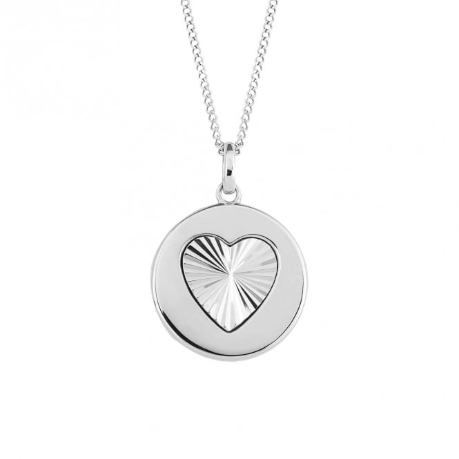 This pretty pendant features a heart-shaped disc crafted from white gold, with diamond-cut detailing for added sparkle. This pendant is a simple and stylish way to add a touch of luxury to any outfit.