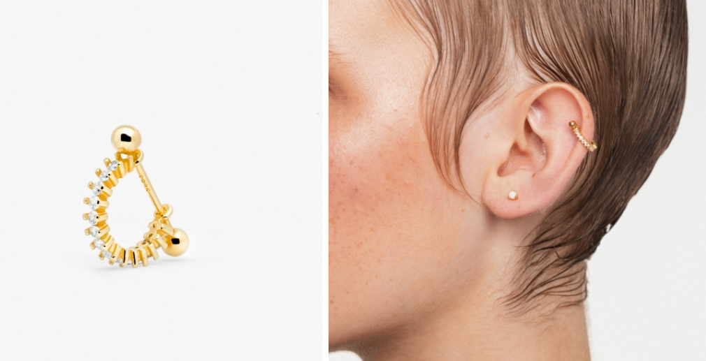 The dazzling Earring with Zirconia is crafted from 925 silver and plated with luxurious 24-carat gold, this petite earring is designed to adorn the upper part of your ear. Its hanging semicircle, adorned with shimmering white zircons, adds a touch of sparkle to any ensemble. With a stud length of 11 mm and a secure pin closure, it’s the perfect blend of elegance and sophistication.