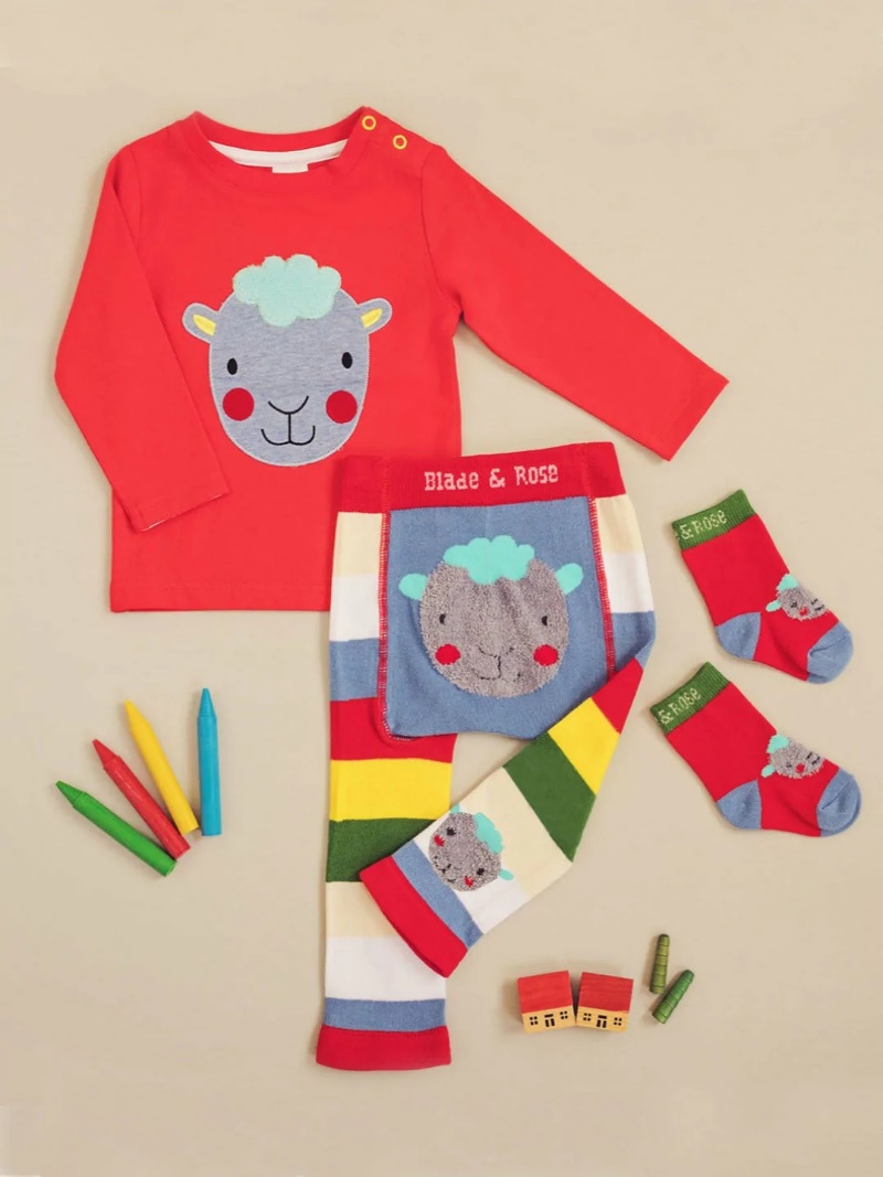 Drawing inspiration from the Lakeland fells around us, let us introduce Blade and Rose Bright Sheep Design. Leggings featuring fluffy grey sheep on the bottom and on the front just above the cuffs. Top with a grey Jersey face and a fleece quaff. This bright red shirt is designed to stand out from the crowd. This bundle also has matching socks with fluffy grey sheep.