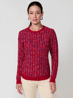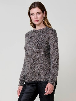 Women’s marbled knit sweater, round neckline, metallic thread, and decorative glitter on the neckline.