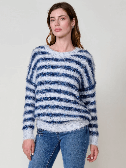 Women’s knitted sweater with soft-touch fur, round neck, long sleeves, multicolored striped design, and a Koroshi metal plate.