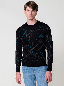 Men’s black tricot sweater with round neck and long sleeves. 100% acrylic fabric, comfortable, versatile, and timeless.