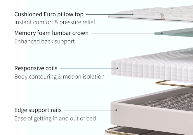 The Saatva Classic isn’t your average bed-in-a-box. It’s a luxury innerspring hybrid mattress featuring a plush Euro pillow top, a dual-coil support system, and enhanced lumbar support designed to promote healthy spinal alignment.